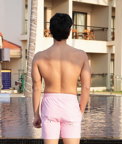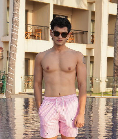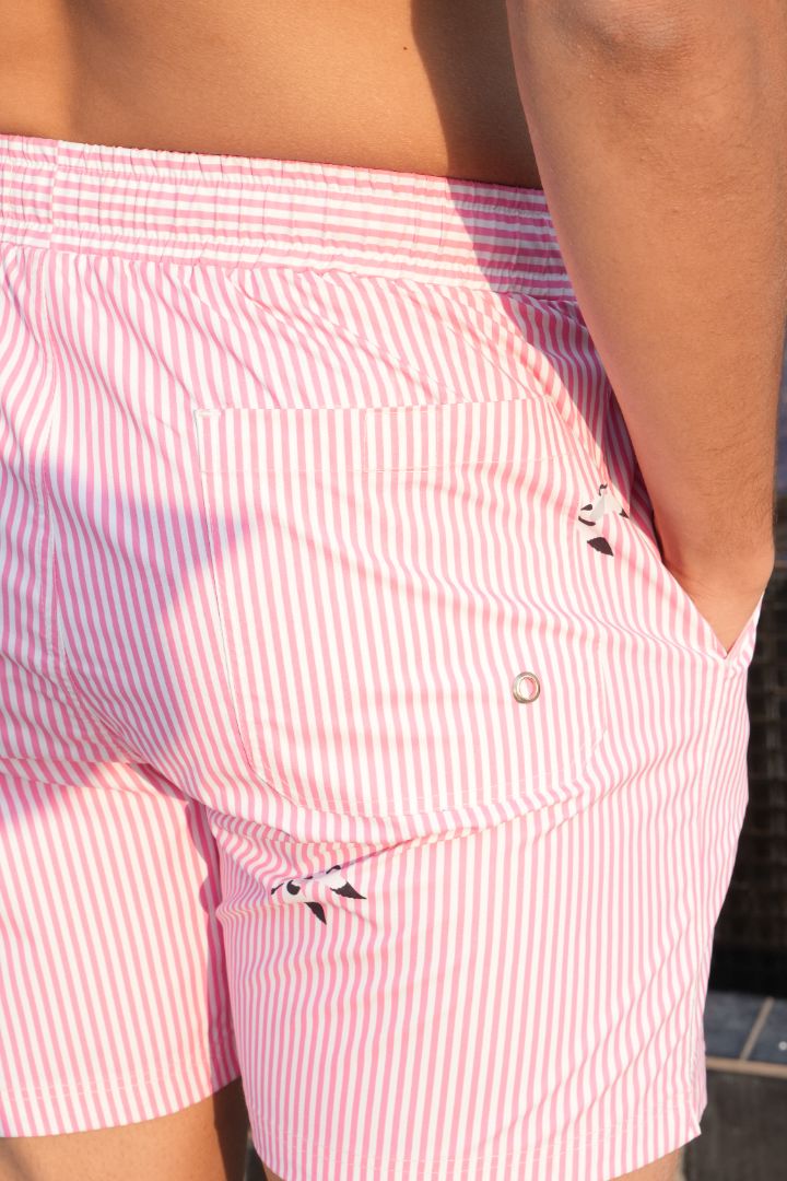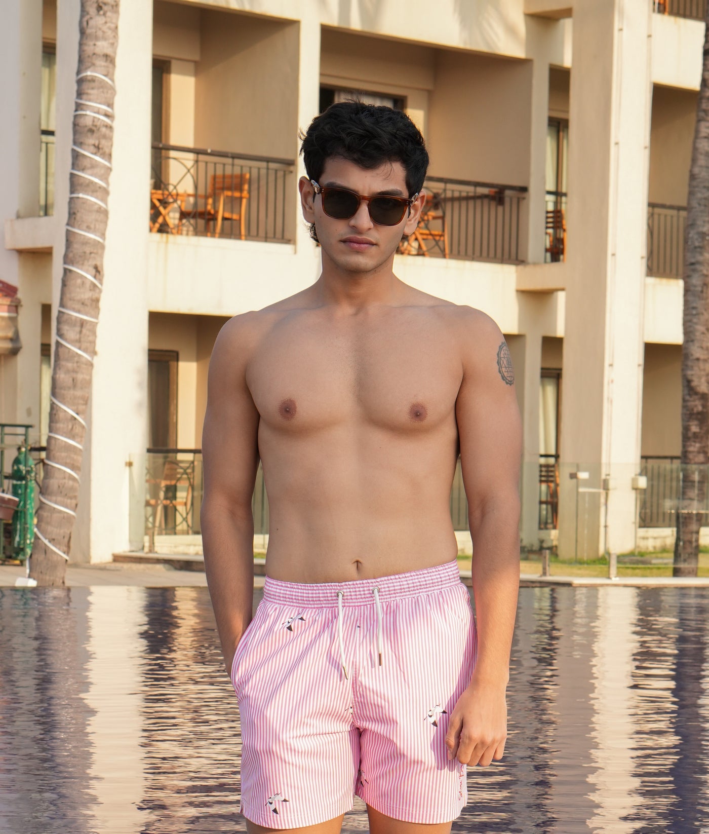 Dive into the season with Shore Borne's chic pink-striped swim shorts, featuring our iconic "Scooper" mascot. These swimming trunks are built for all-day comfort with soft mesh linings and practical pockets. Whether you're lounging by the pool or playing beach volleyball, these striped men’s swim shorts combine style and practicality effortlessly.